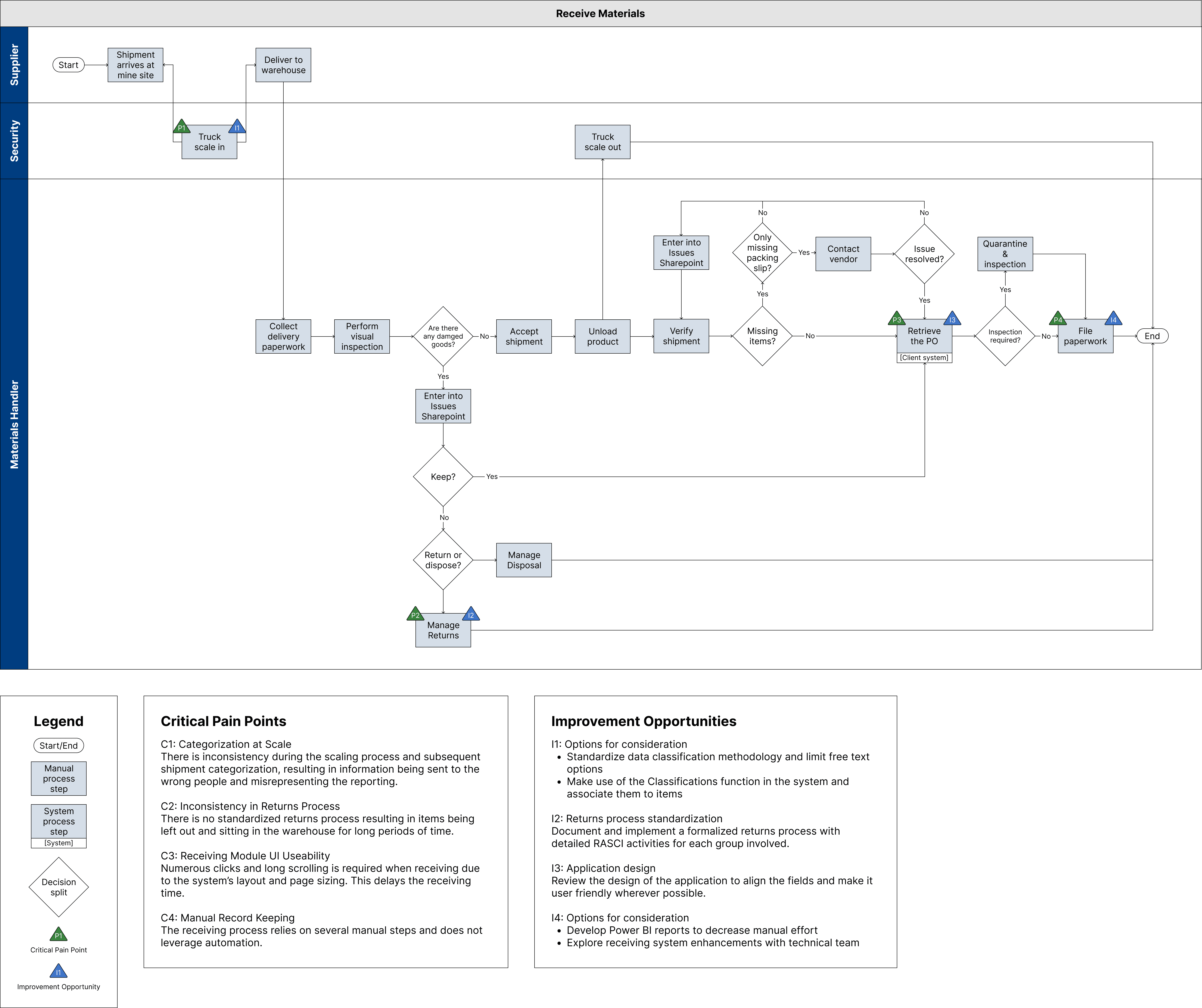 I developed detailed process mapping of all warehouse and inventory management activities to identify key system and user pain points. My team and I then identified key areas of opportunity to increase process efficiency.