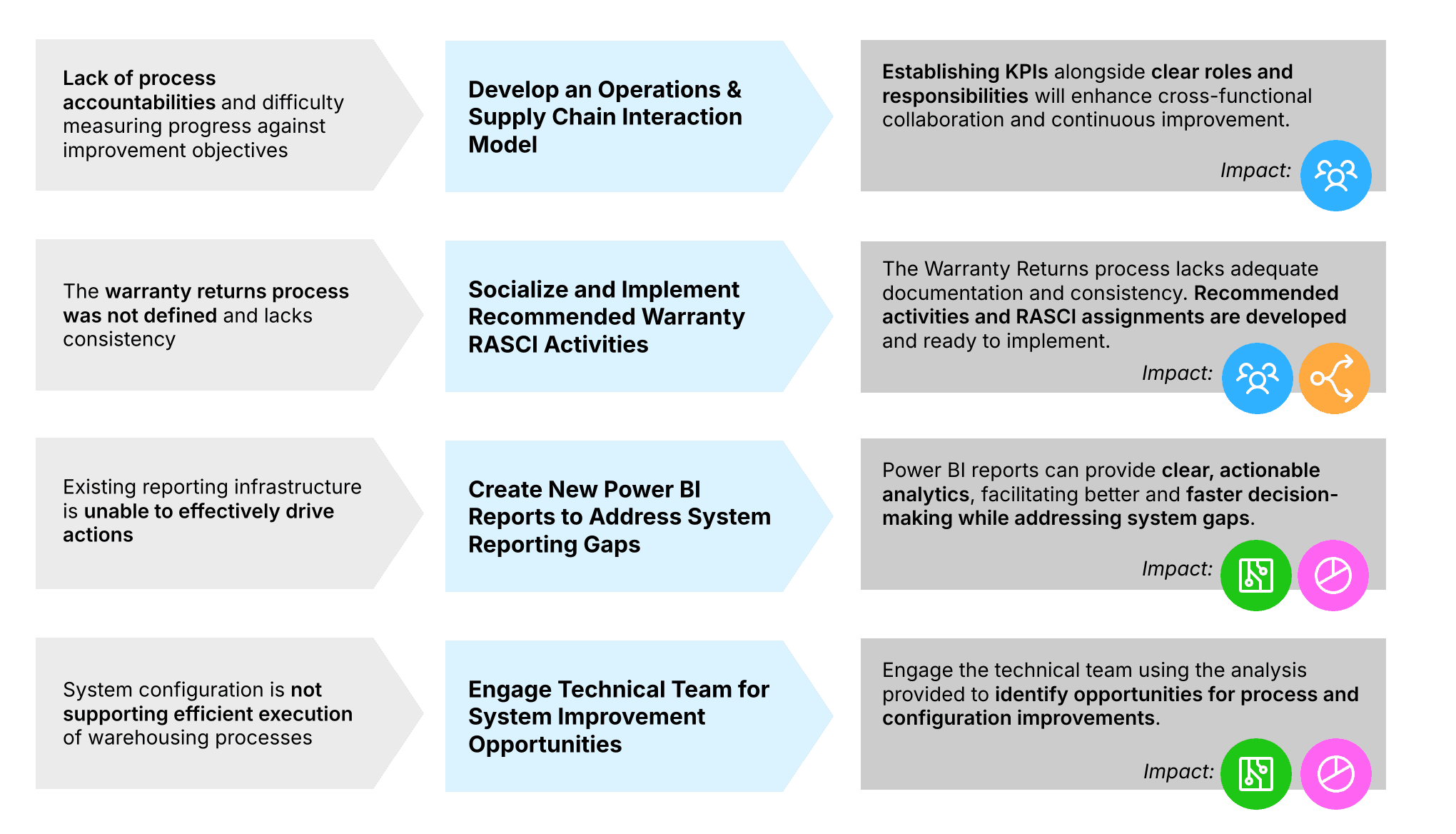 Through detailed analysis of the client's inventory, the team identified $13 million in inventory reduction savings through a process to manage obsolete items. After numerous cross-functional design workshops with stakeholders from Finance, Procurement, and Warehouse teams, I led the development of a recommended future state RASCI for the Returns process which clearly stated the roles and responsibilities of every stakeholder involved.
