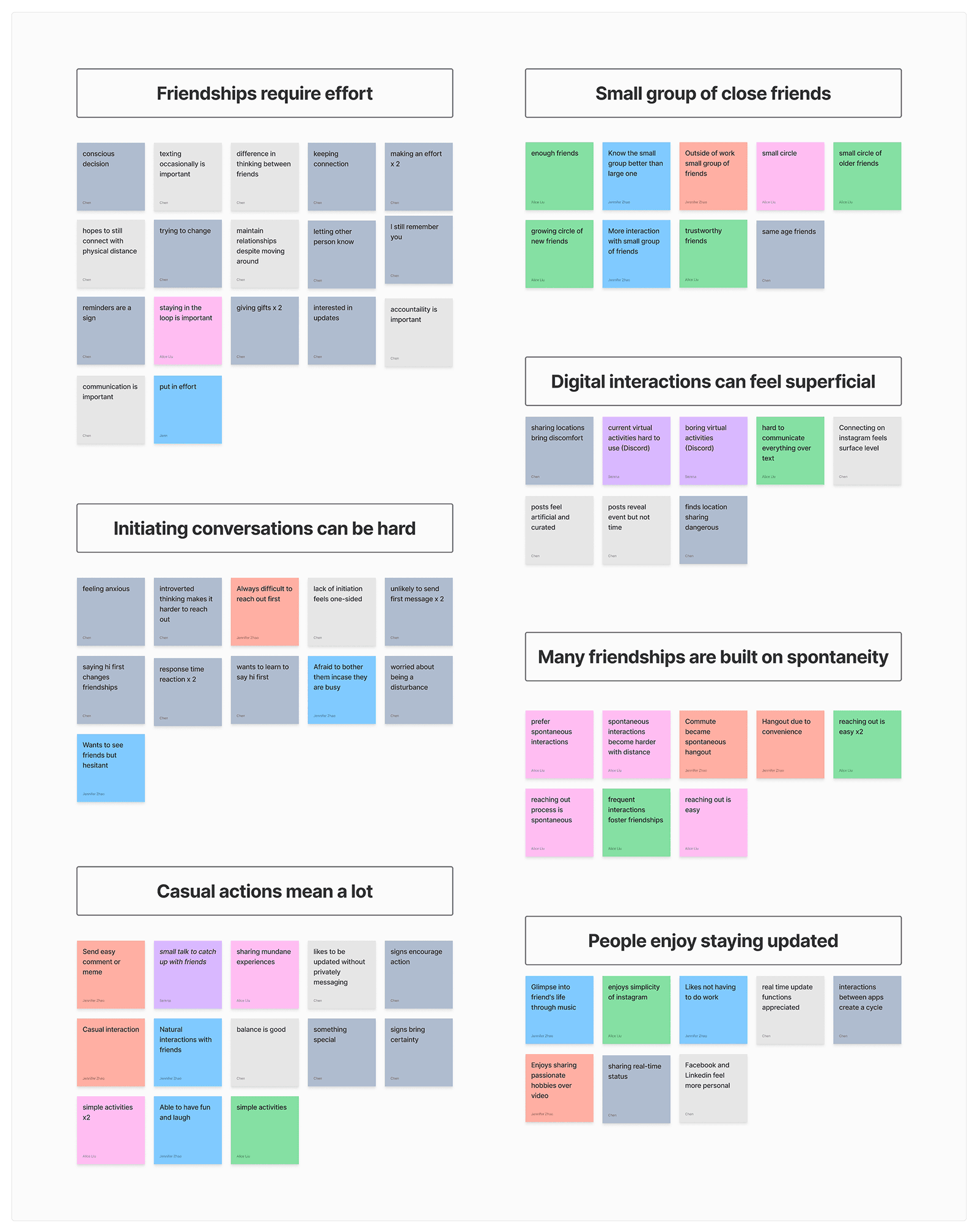 With each major finding on a sticky note, we grouped the insights by similarity and topic. I led the analysis around the nuances of digital interactions. The following themes emerged: