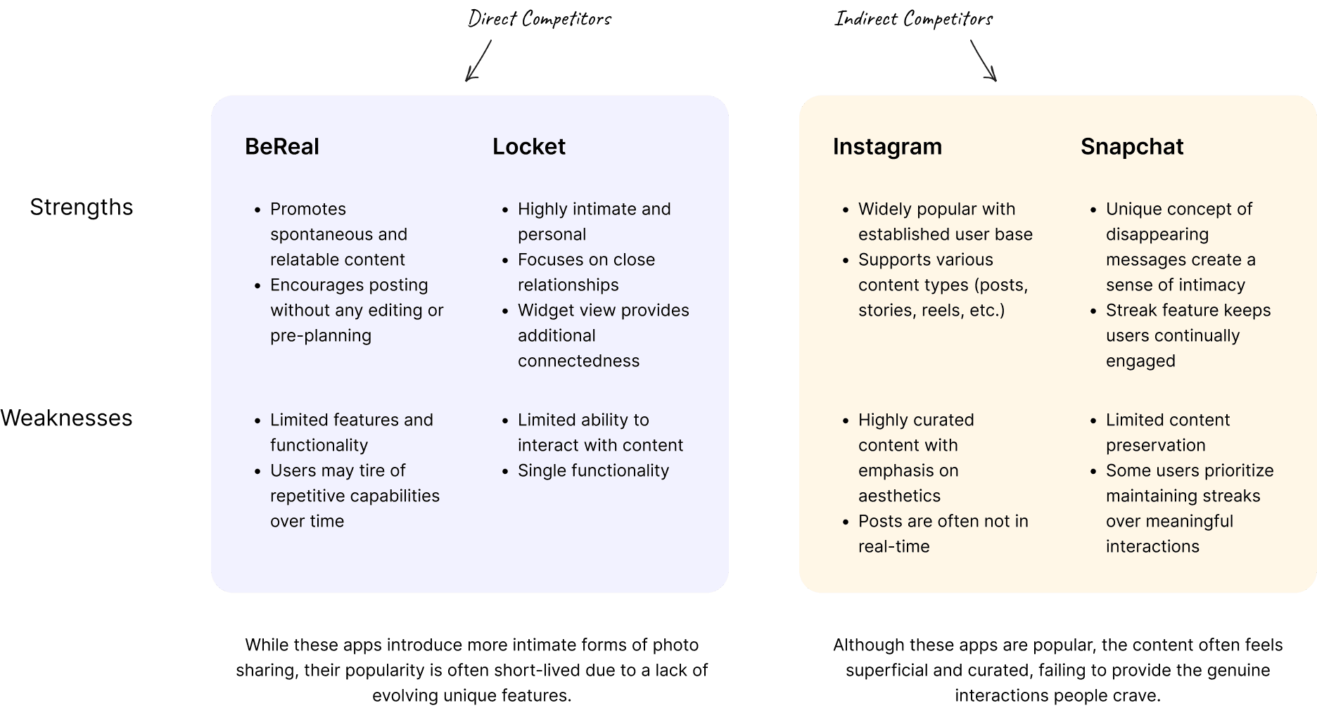 There are many social networking platforms currently available, but do they meet the needs of our target audience? We researched our most prominent competitors: BeReal, Locket, Instagram, and Snapchat.