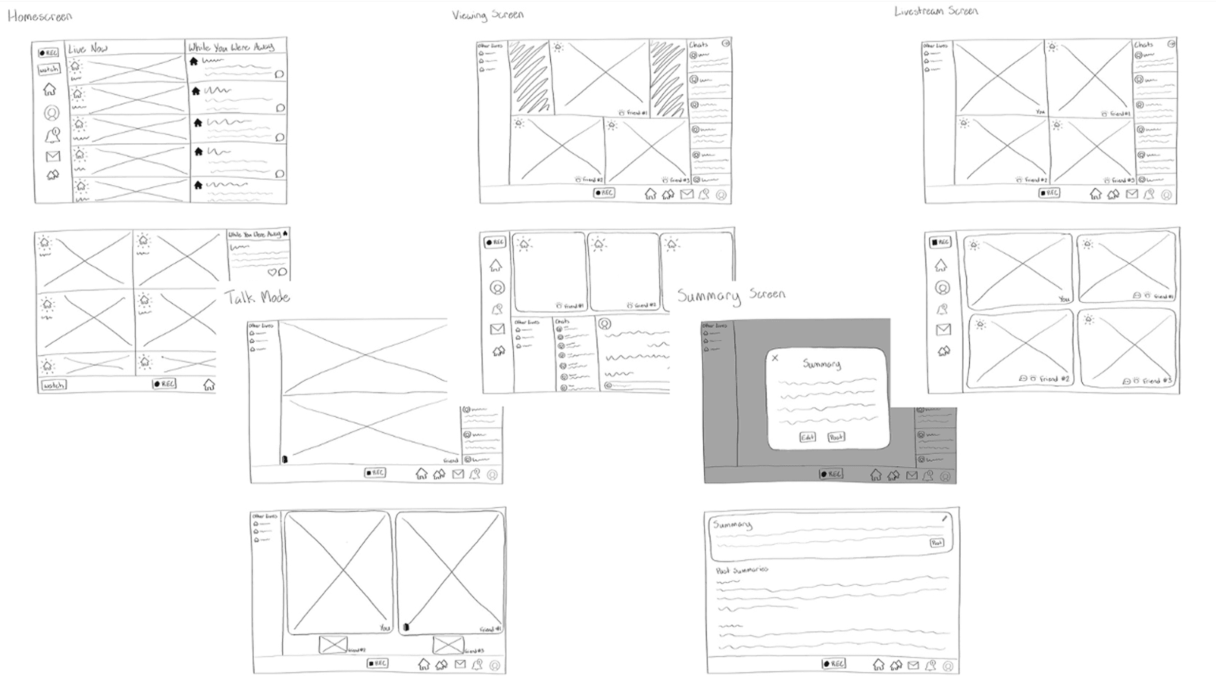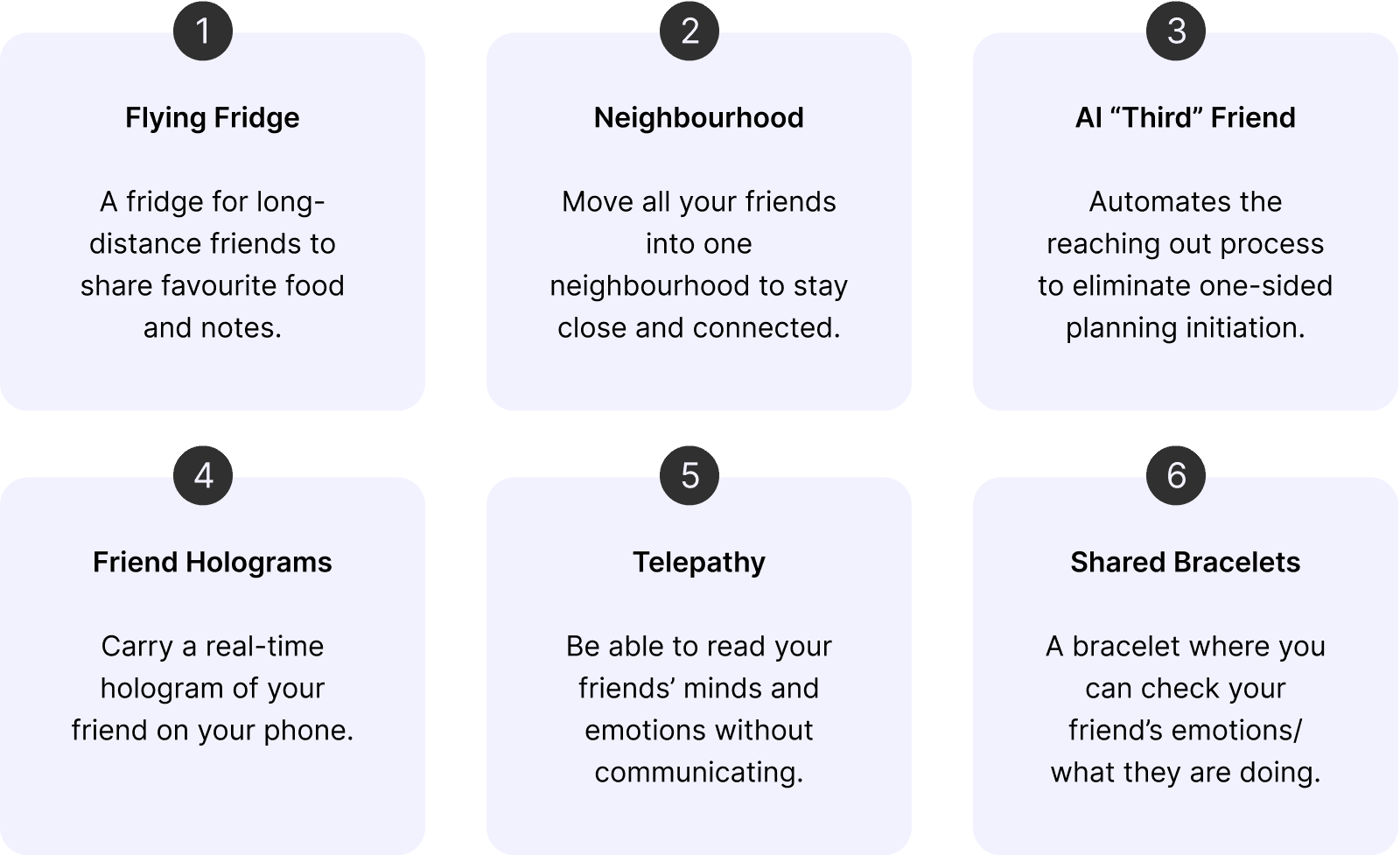 To kick off the ideation phase, we used the Crazy Eights method, a rapid brainstorming technique where each team member sketched eight ideas in eight minutes. This method encouraged quick, creative thinking and helped us generate a wide range of concepts—ranging from practical solutions to bold, imaginative ideas—each aimed at fostering meaningful connections.