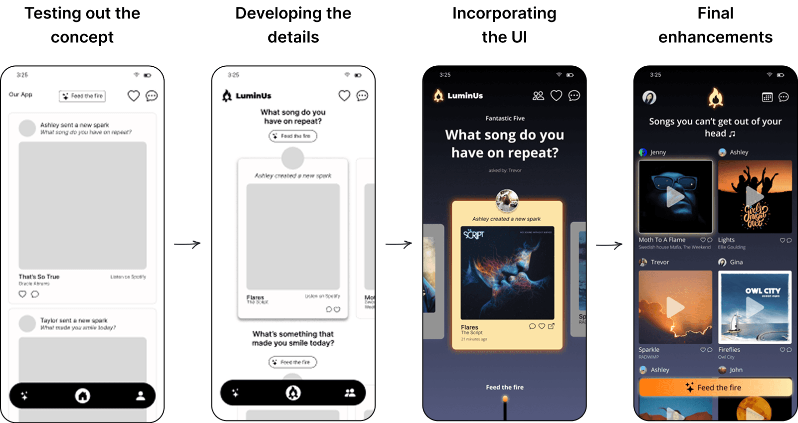 After (multiple) more rounds of brainstorming, prototyping, and feedback gathering, the concept of LuminUs arose. I worked closely with Chen to design and iterate upon our high-fidelity prototype.